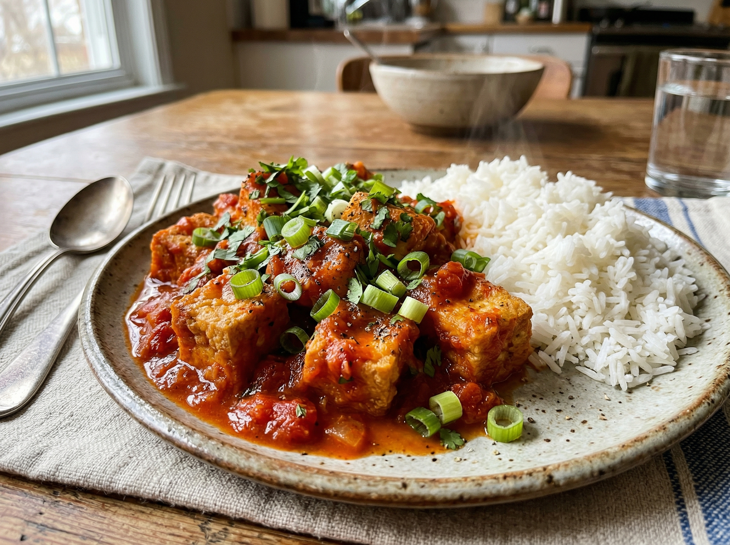 A simple family comfort food featuring fried tofu simmered with softened tomatoes.